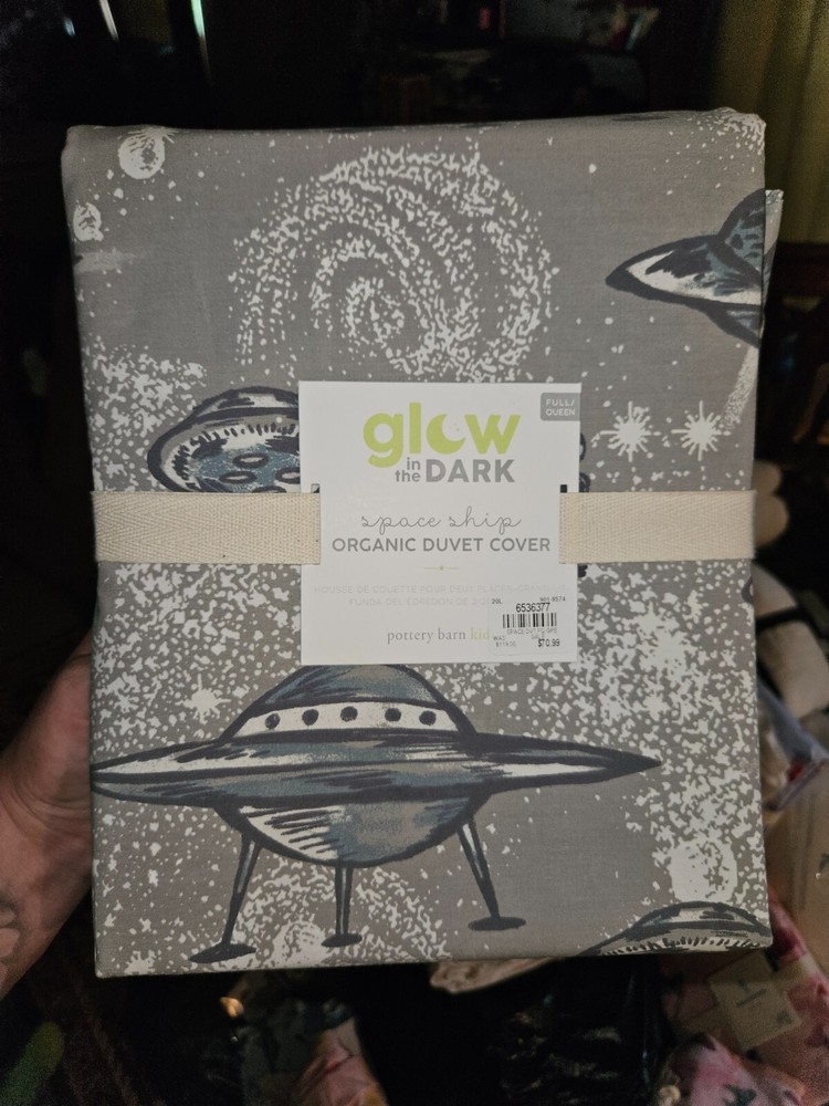 Embark on an interstellar journey from the comfort of your own home with the Pottery Barn Space Ship Organic Duvet Cover. Designed for the Queen-sized bed, this Full/Queen duvet cover features a gray color palette with a unique space theme that will transform your bedroom into a celestial sanctuary. The set includes just the duvet cover, allowing you to integrate it seamlessly with your existing bedding ensemble.Crafted with care, this duvet cover not only offers a timeless aesthetic but also prioritizes comfort and durability. The organic fabric provides a soft and serene touch, ensuring a restful night's sleep. Whether you're an avid astronomer or simply appreciate the beauty of the cosmos, this duvet cover brings a touch of the starry night into your personal space.