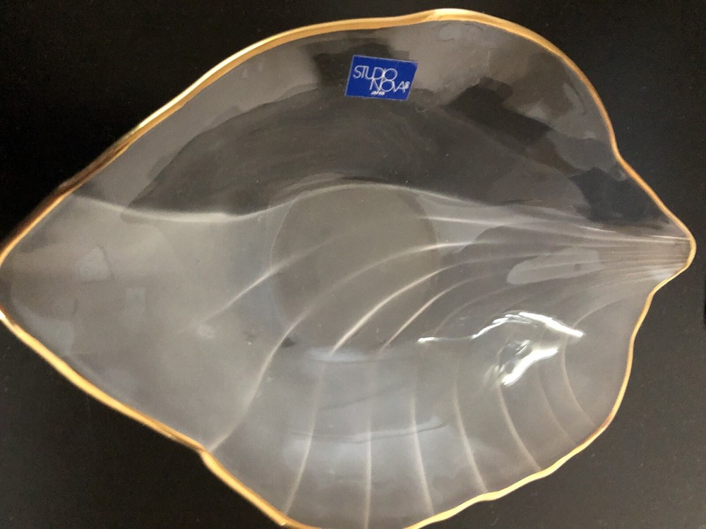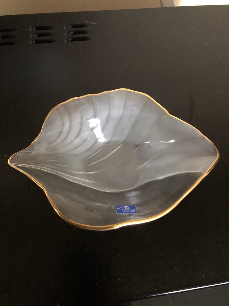 studio nova candy/nut dish, clear & frosted glass, leaf shaped, gold trimmed.