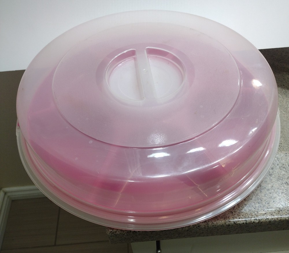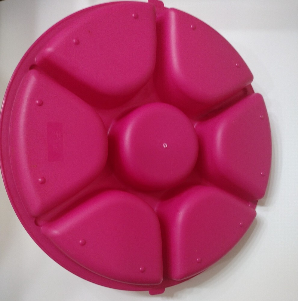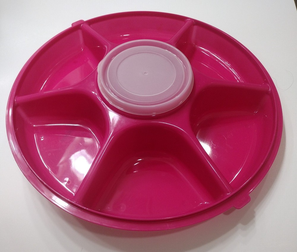 Food tray vegetables fruit taco fixins chips dip bowl round lidded hot pink. 6 compartment serving tray. Removable center dip bowl with snap on/off lid. New. Bright hot pink base color. Lock tabs and easy twist open. Hard sturdy plastic. Indoor outdoor use. No damage. Light reflection in pic. Easy clean up. Bring to the party or stay at home usage. Great craft storage idea-beads-rings-bracelet making. Tiny parts toy storage, Legos...Picnic or car rides. 14 inches across X 4 inches tall ( with lid )