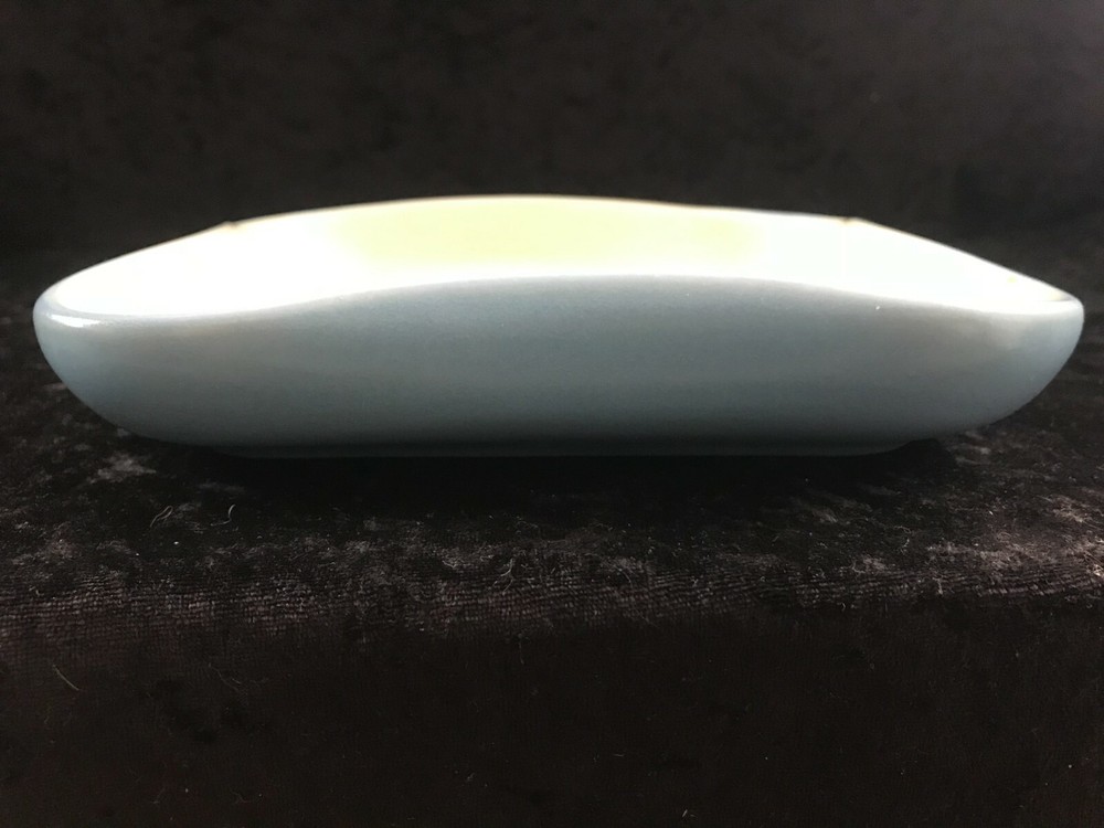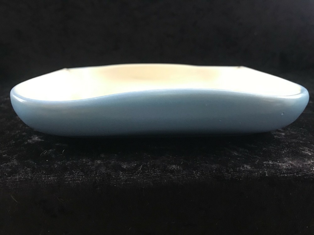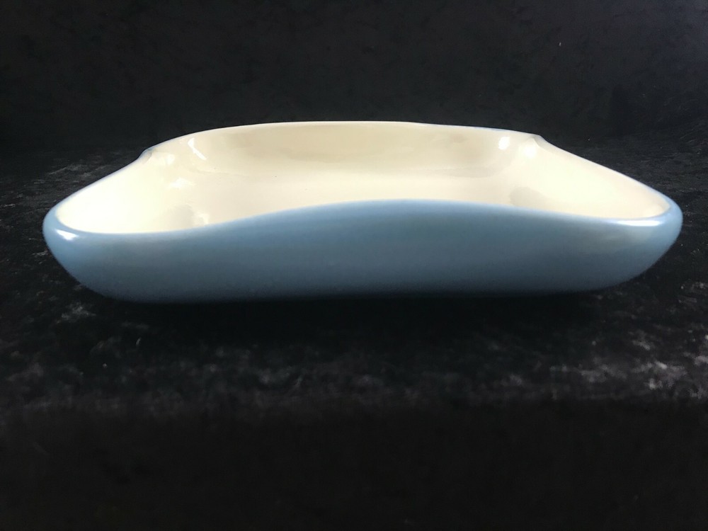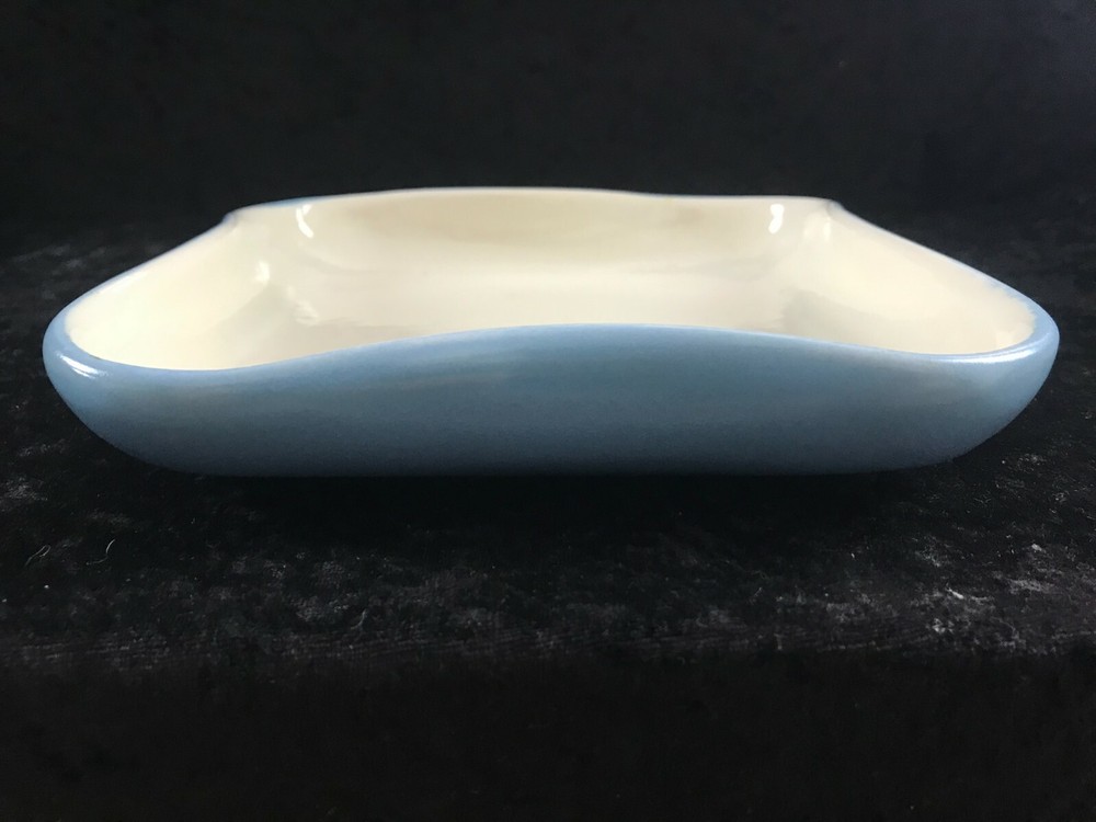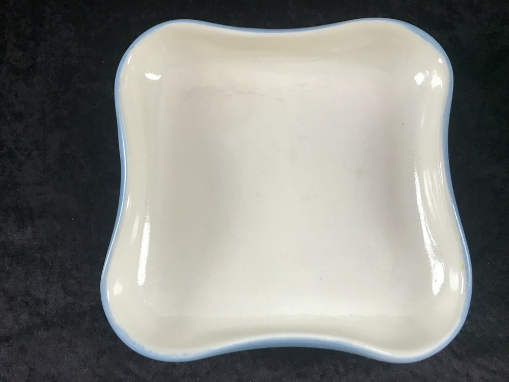 (621) vintage Art Studio Pottery Square Pinched Edge Dish White Blue 7" Across . In good used shape.