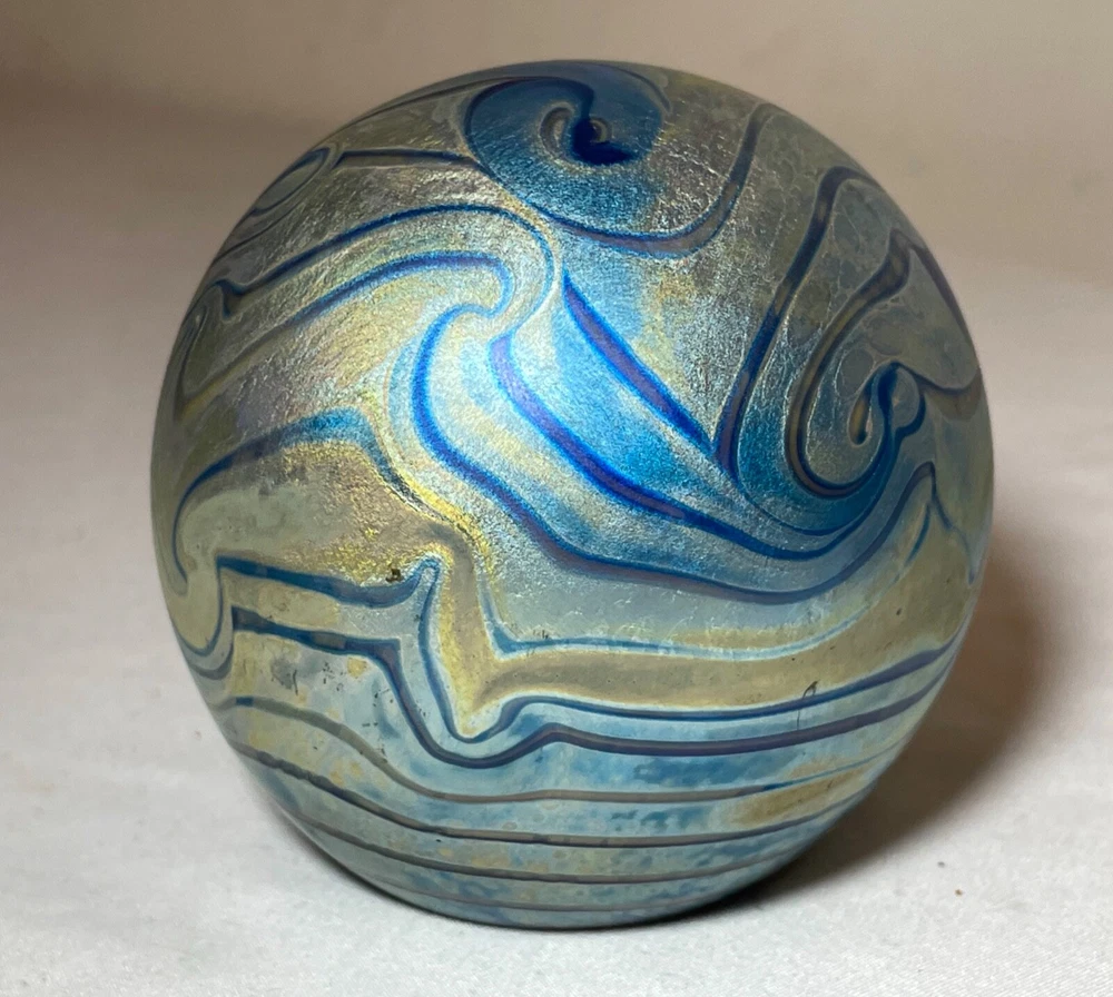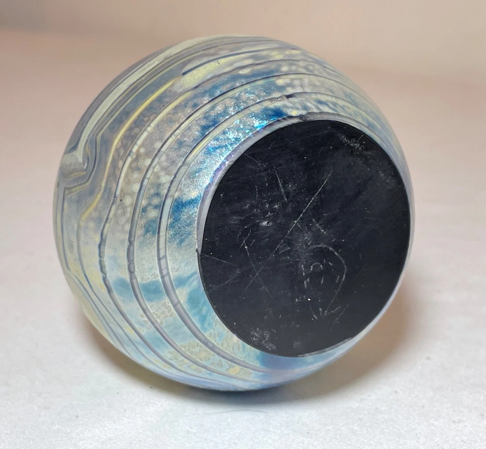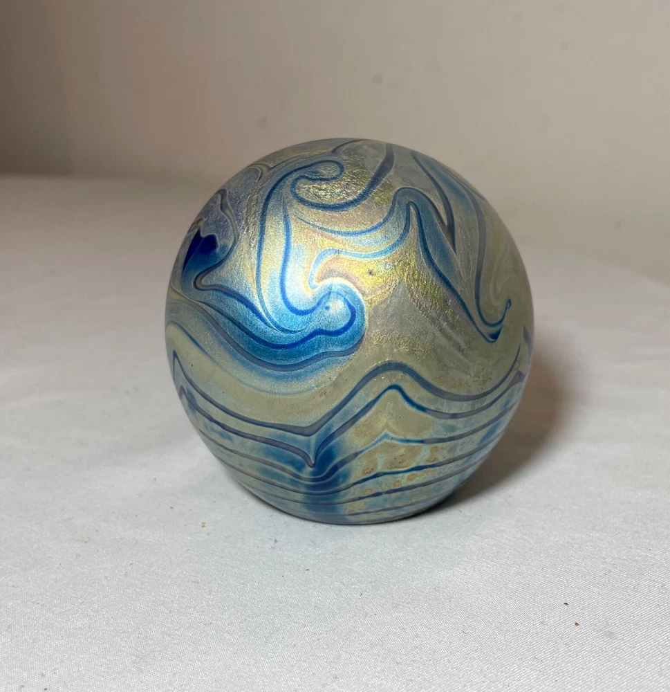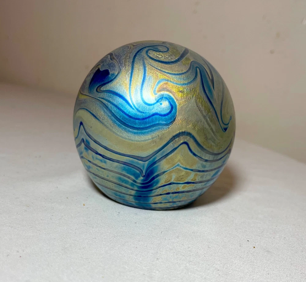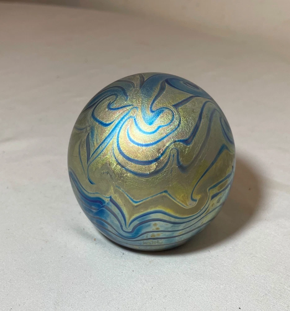 Up for sale is a wonderful hand blown art glass paperweight. It is done with an exquisite swirled detailing, has very rich iridescent color, and an aurene finish that shines all colors of the spectrum. It's signed underneath but hard to make out and measures 3 inches tall by 3 1/4 inches wide. Thank you for visiting "Dusty Treasures " and please feel free to browse through my online ebay store where you can find several more wonderful items similar to this.