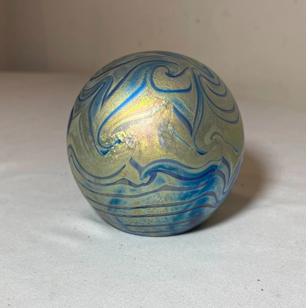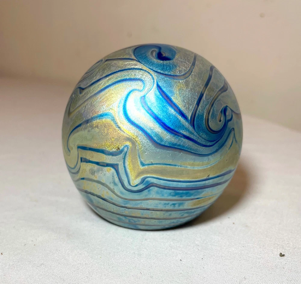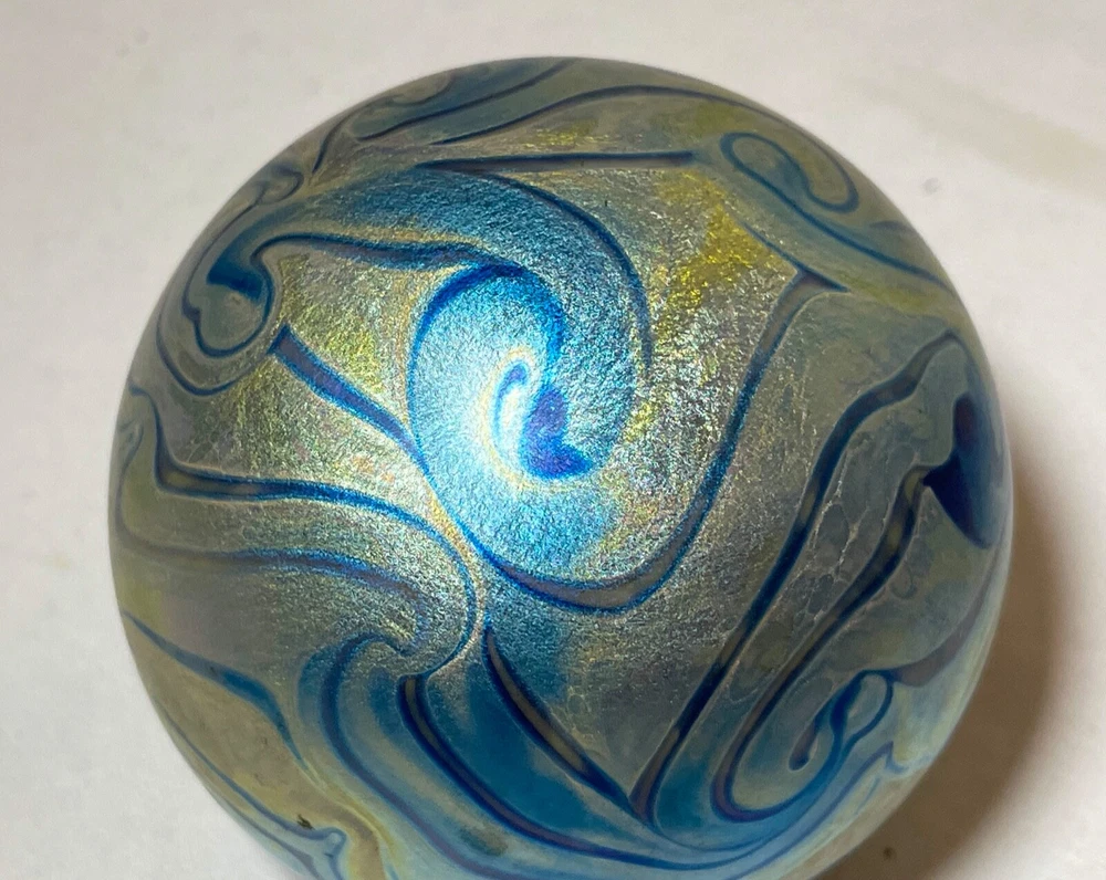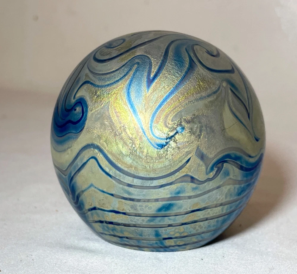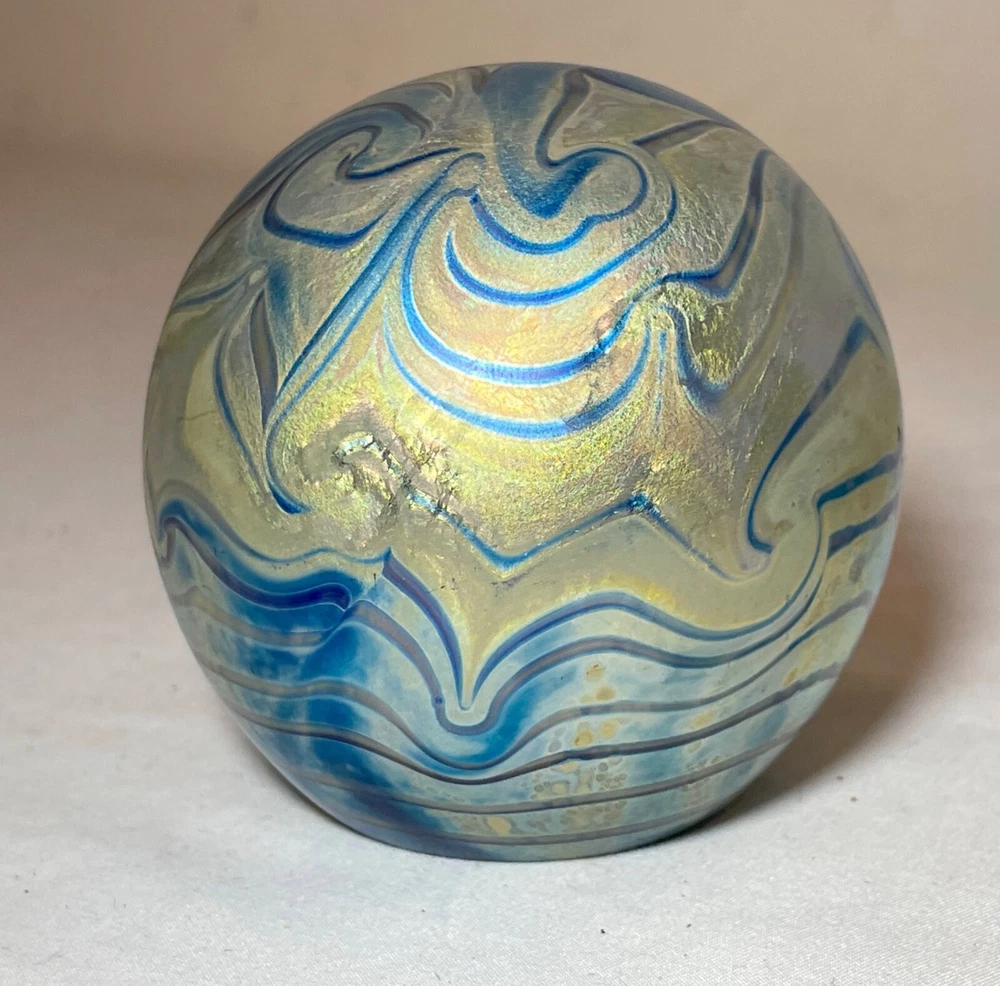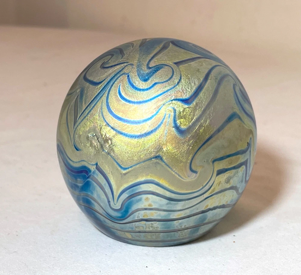Up for sale is a wonderful hand blown art glass paperweight. It is done with an exquisite swirled detailing, has very rich iridescent color, and an aurene finish that shines all colors of the spectrum. It's signed underneath but hard to make out and measures 3 inches tall by 3 1/4 inches wide. Thank you for visiting "Dusty Treasures " and please feel free to browse through my online ebay store where you can find several more wonderful items similar to this.