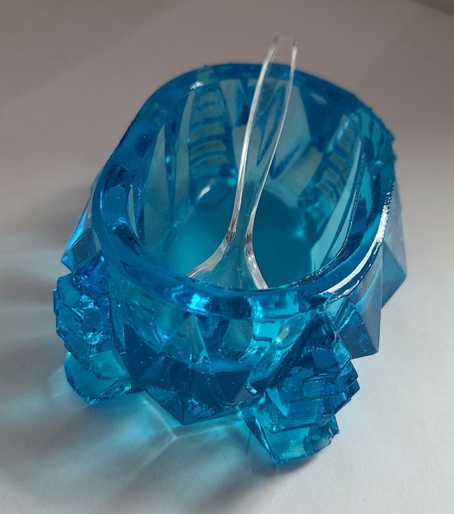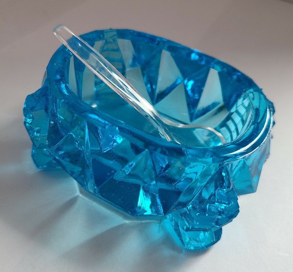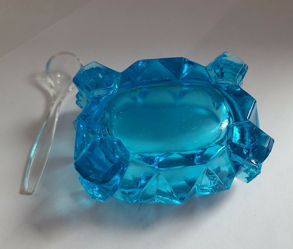 EFFECTIVE MARCH 12, 2023 >>> NO SHIPPING UNTIL ITEM PURCHASE PAYMENT IS RECEIVED IN FULL >>> FREE SHIPPING DELAYED UNTIL ITEM PURCHASE PAYMENT FROM BUYER IS REC'D BY SELLER >>> THANKS FOR YOUR PATIENCE & UNDERSTANDING. FREE SHIPPING USA - Alaska, Hawaii incl (No Global Shipping, at this time.) All items are consigned; prices, discounts, offers subject to consignor approval / But... remember... our consignors L*O*V*E to sell! (So don't hesitate to Make An Offer!) :) all items are old reused preowned antique retro collectible vintage - NOT NEW LISTED : medium blue COLOR SALT CELLAR DIP OPEN DISH / geometric type pattern / roiling in glass / (see: pix) Plastic SALT SPOON INCUDED *Large MASTER SIZE Salt NOTES : consignor MBT#1 / Box #4 PLEASE ASK FOR MORE PIX, if necessary :) DIMENSIONS : (approx.) Salt: 2-3/4" x 2-3/8" x 1-3/8" Spoon: 2-1/2" PHOTOGRAPHY : additional pix available upon request / most items have 20+ pix on file all items have "preowned characteristics" that include but are not limited to: minor bings, dings, flea bites, rubs, bruises, nicks, etc. (we try to note and photograph for accuracy) FREE SHIPPING all States - inc Alaska & Hawaii your purchase may arrive in recycled packaging